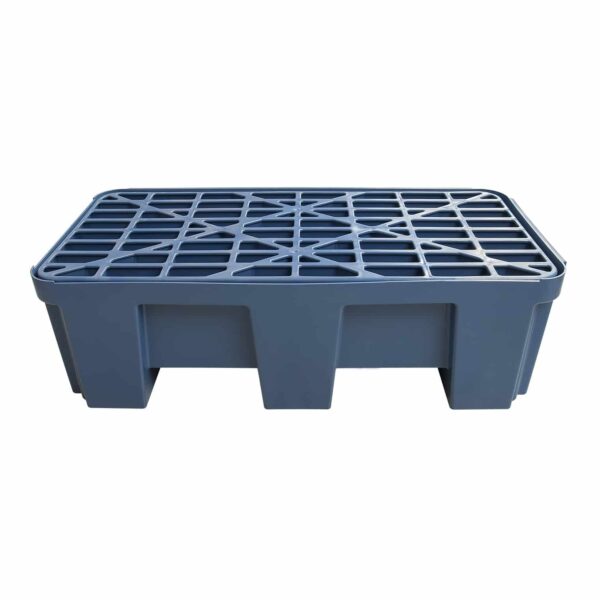 Drum dump pallet with removable platform. Made of polyethylene. Multiple spill pallets can be easily assembled to create a larger platform.
