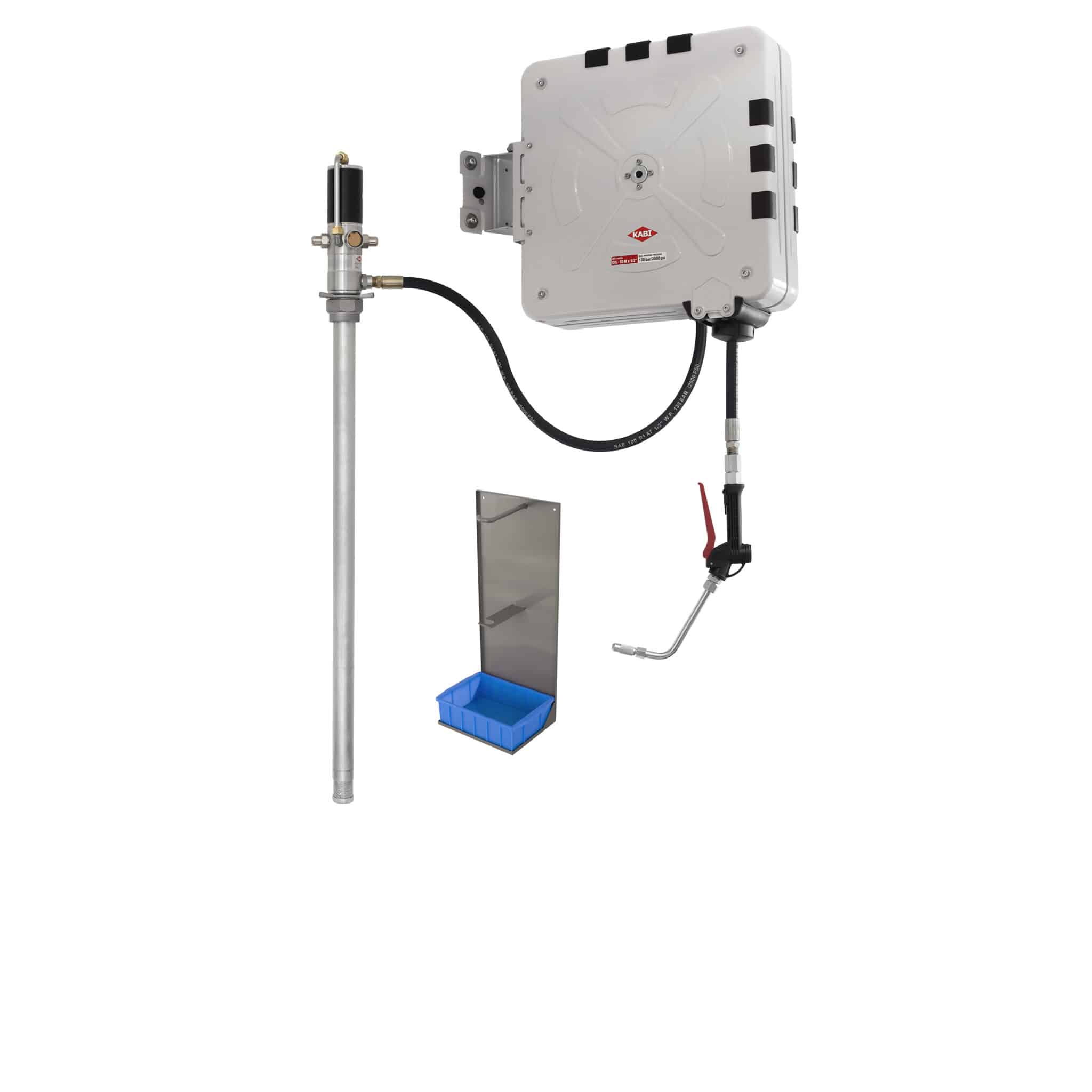 KABI légműködtetésű olajszivattyú 3:1, 200 ltr. (60263). Zárt tömlőtekercs, forgókonzollal együtt. Olajszabályozó pisztoly csepegtető szeleppel (40400). Csöpögtető tálca az olajvezérlő pisztolyhoz (60699).